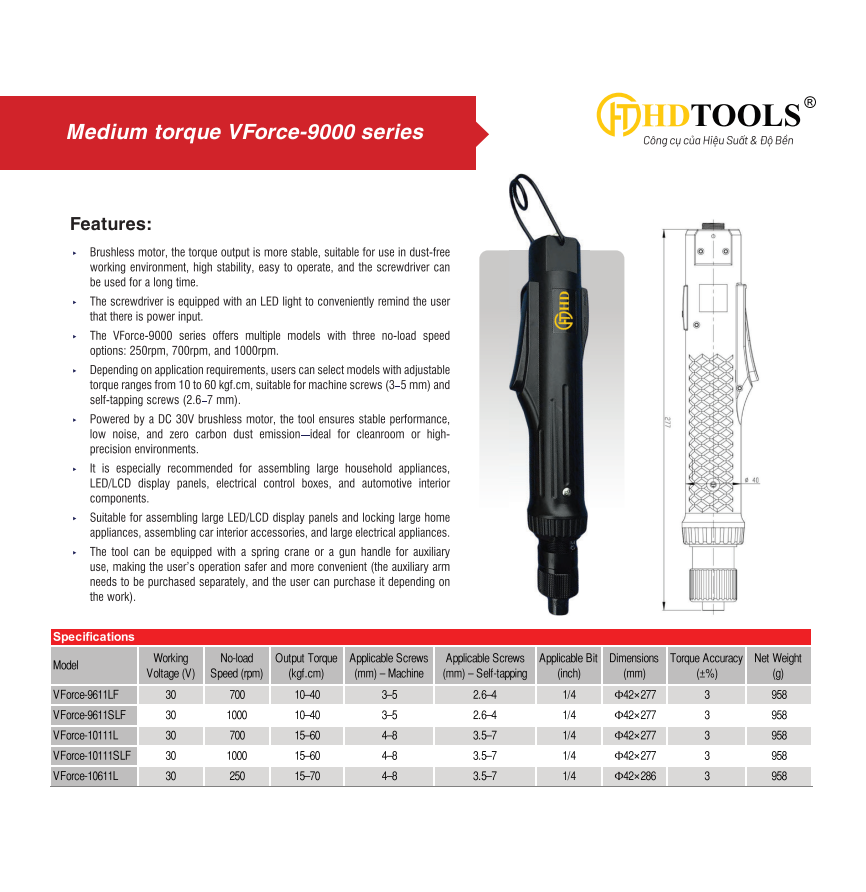 Máy bắn vít điện không chổi than HDTOOLS VForce-9000 Series – Giải pháp siết vít công nghiệp chính xác & bền bỉ