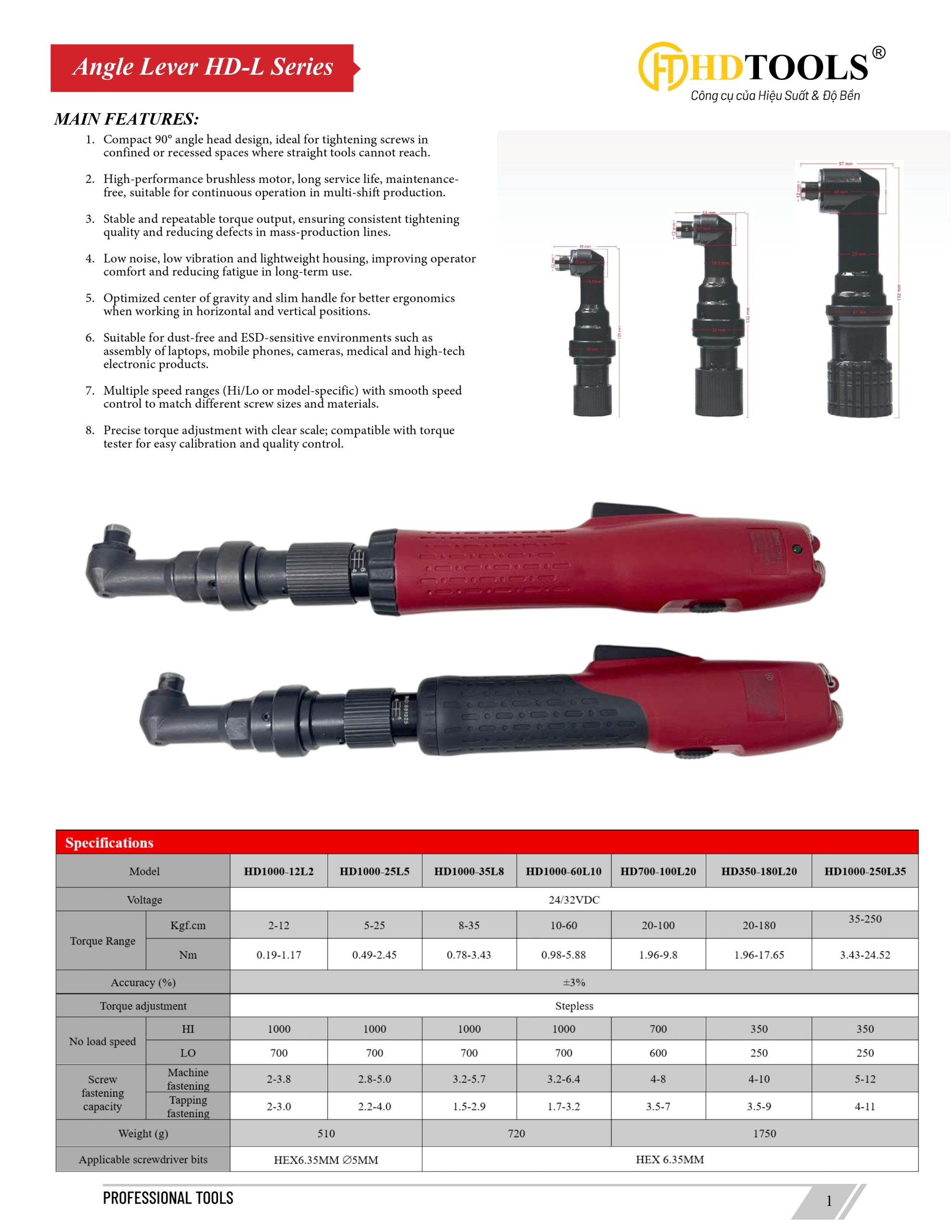 Để đáp ứng nhu cầu đó, HDTOOLS – thương hiệu thuộc Công ty TNHH Kỹ Thuật Lập Hưng, đạt chứng nhận ISO 9001:2015, giới thiệu dòng Angle Lever HD-L Series – máy bắn vít vặn góc 90 độ chuyên nghiệp, thiết kế nhỏ gọn, lực siết ổn định và phù hợp cho các môi trường sản xuất yêu cầu độ chính xác cao.