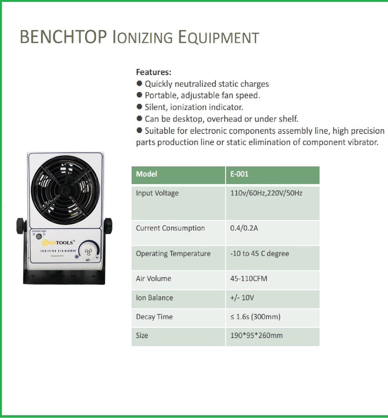 HDTOOLS HD-E-001 là thiết bị khử tĩnh điện dạng quạt để bàn (Benchtop Ionizing Fan) chuyên dùng để trung hòa nhanh các điện tích dương và âm, giúp ngăn chặn hiện tượng bám bụi, phóng tĩnh điện trên linh kiện điện tử, bảng mạch PCB, khuôn nhựa, hoặc các sản phẩm có độ nhạy tĩnh cao.